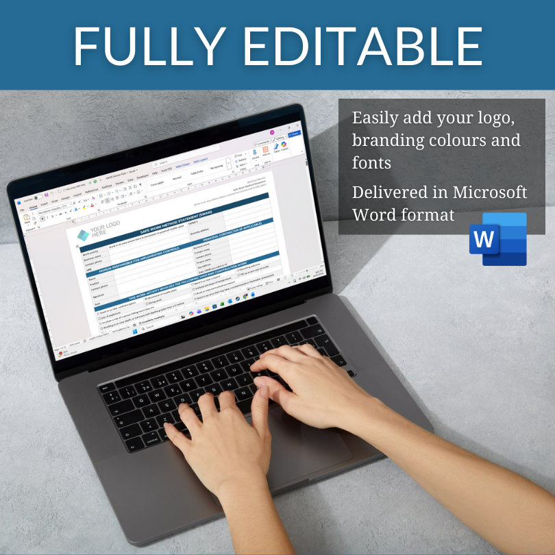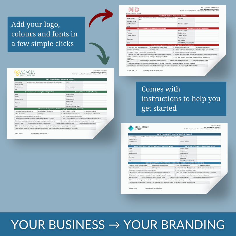 Acacia Safety Consulting’s WHS forms and documents are fully editable Microsoft Word or Excel files that can be customised to include your own content and branding, including your business name, logo, fonts and colours. Customisation instructions are included with each purchase, or you can add our custom branding service to your order if you prefer.